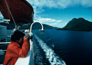by Peko プンタ・アレナスは町中にタンポポが咲き乱れていて、いかにも春爛漫といったところです。太陽はなかなか沈まず、午後11時頃やっと夕闇が訪れます。昼が長いのはなんとも得をした気分でよいのですが、どうも活動しすぎるらしく毎日疲れています。日本との時差は−12時間なので、こちらの夕日が日本では翌日の朝日です。地球の裏表で同じ太陽を見ているのかと思うとちょっと不思議な気分です。 11月10日、首都のサンチャゴから出ている、上下左右前後(!)に激しく揺れる今にも脱線しそうな列車に20時間乗って、約1,OOOq南の町、プエルト・モンに着きました。プエルト・モンは海に面した斜面に開けた小さな港町です。ここでプンタ・アレナスに向かう船に乗りかえます。プンタ・アレナスヘの定期便は10日に1便。野菜や果物を運ぶ貨物船が、「ついで」という風に旅行者を運んでくれます。船待ちのために旅人が集う町でもあります。私達も船を待つ間、一泊1,500円(朝食、シャワーつき)の民宿に、一週間近くお世話になりました。 貨物船に乗りこんで通されたところは、大きなトレーラーが何台も並ぷ甲板。その傍らに大型のコンテナを10個くらいくっつけたようなものが高床式に溶接されていて、その中がリクライニングシートの並ぶ大きな客室と食堂になっていました。丸4日間の船旅の料金は3食付きで約8,500円(貧乏旅行者向けツーリストクラス)。とはいえ、船室の狭苦しさとは逆に食事はなかなか豪勢でした。日暮れの遅いこのあたりでは午後10時頃に「オンセ」という夜食の時間がありますが、これも(別料金でしたが)ちゃんと用意されていました。調理室を覗きに行くと、料理中のコックさんが大きなシーラを掲げて見せてくれました。 何度も航海を重ねているはずの乗組員でさえついつい見惚れるほどに美しいフィヨルドの中を進む船旅は、晴天続きで波もなくすこぷる快適です。ときどき、ひょうきんな顔をしたオタリア(アシカの1種)が興味ぷかげに近づいてきたり、大きなフルマカモメが船にまとわりついてきたり。途中8時間ほど外洋に出ましたが、激しいうねりの中を4頭のクジラが近づいてきて私たちを楽しませてくれました。4日目の朝、南緯50°を過ぎてマゼラン海峡に入るとさすがに天気は崩れ、雨、雪、雹が晴れ間をはさんで目まぐるしく交代しながら吹き荒れました。気温は4℃前後。風は強く、雨が降るたびにフィヨルドに真っ白い滝ができました。 出航から4日目の深夜、プンタ・アレナスに入港しました。船はここで積荷を羊に替えて、またプエルト・モンに帰って行きます。私たちは2〜3日後、250q北にあるプエルト・ナタレス(チリ)に移動し、そこからアルゼンチン国境近くに広がるトレス・デル・パイネ国立公園に向かう予定です。 それでは、 また。 プンタ・アレナスにて 1989.11.25 |